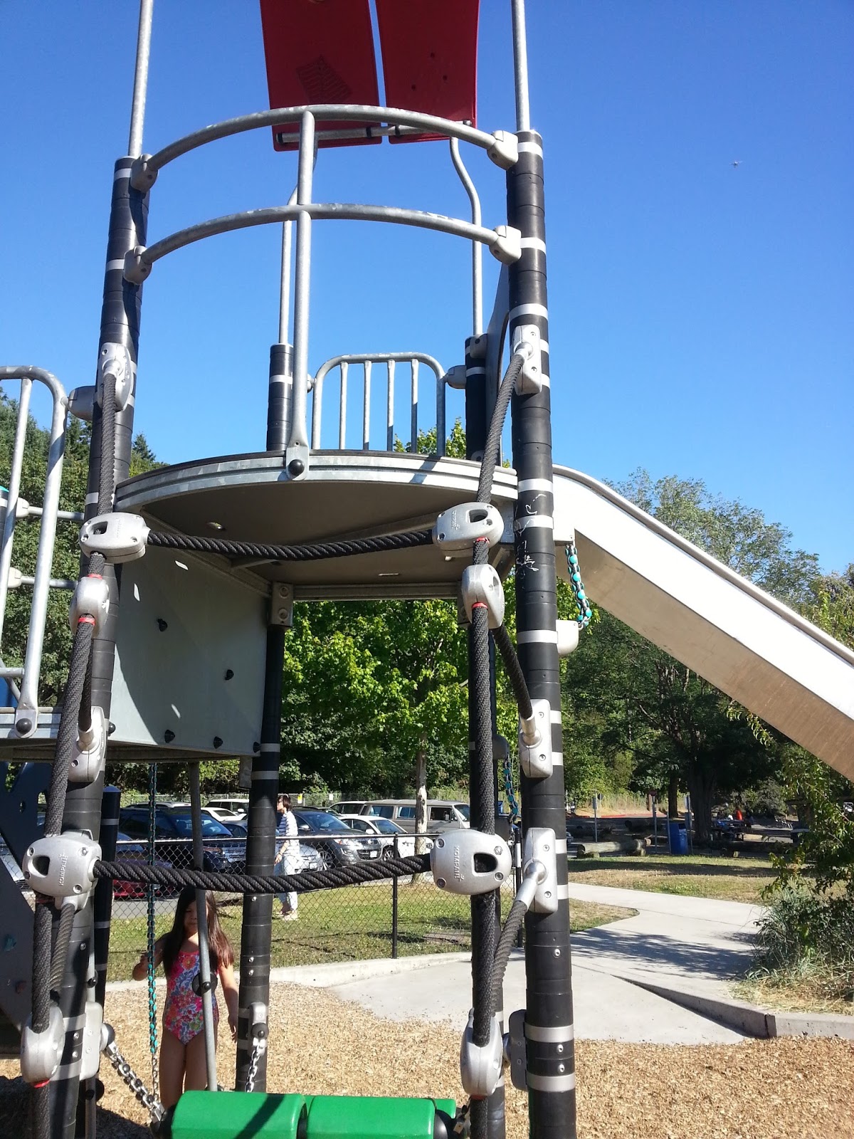 Our kids had a great time on the unique playground. The ship design of one of the major pieces is cool, but we really like the rope net climbing dome, one of our handful of favorite pieces of play equipment we saw on our park tour. A large field neighbors the playground, excellent for improvised ball or Frisbee play. Decent seating for parents/chaperones and a clean environment round out a very nice play area.
